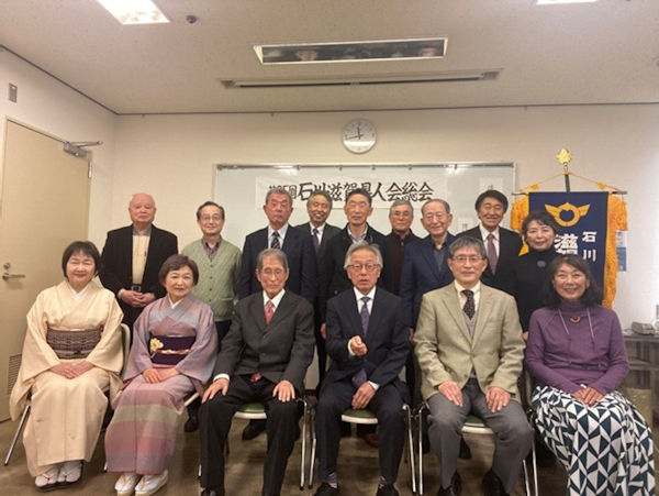 石川滋賀県人会は、令和8年2月15日(日)金沢市の金沢勤労者プラザで、出席会員15名委任状5名のもと、午前10時に岡田副会長の司会で始まりました。当日は、去年と同様、春の訪れが近いことを思わせる、温かく穏やかな天気に恵まれました。 冒頭堀会長より、「開催が一週間前だったら選挙はあるは、雪は降るわ、で大変でした。皆さんの日ごろの心がけのお陰です」との挨拶があり、続いて、杉本顧問が、「私の故郷の長浜市山本山に、今年もオオワシが来ました。オオワシが来るのは、30年連続で、地元では“山本山のおばあちゃん”の愛称で親しまれています」とのことでした。