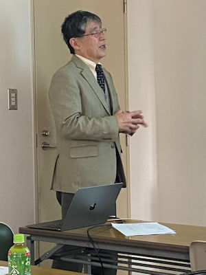 総会後、引き続き講演が行われました。 今年の講師は、当会の会員、望月隆さん。演題は、“甲賀「忍者」の虚像・実情”。 望月さんは、甲賀市甲南町の出身で、町内には、「甲賀流忍術屋敷」があり、いわば、甲賀「忍者」のお膝元。この屋敷は、「甲賀流忍者 甲賀五十三家筆頭格甲賀望月氏本家の旧邸」。望月さんは、この望月家の家紋と実家の家紋は違うけれども、「自分も甲賀忍者の末裔かもしれない」と調査をされ、今回の講演となりました。 甲賀は、7世紀頃より林業が盛んになり、平安初期には、天台宗の寺院が多数建立、修験道が発展しました。10世紀以降荘園が発達、管理者として、地侍が台頭、南北朝以降、“甲賀武士”と呼ばれるようになりました。また、薬草が豊富で、独自の本草学(薬学)が発展し、「忍法」をうかがわせます。この甲賀武士は、戦国時代、信長、秀吉、家康などの勢力争いに巻き込まれ、翻弄されます。江戸時代には、多くは、武士になれず、甲賀で帰農(甲賀古士と自称)しますが、培った兵法を継承する家もあり、「忍者」であることを自覚・主張します。裏返せば、それまで自らを「忍者」と思っていなかった。 江戸時代には、伊賀・甲賀の忍法が、体系化されます。1676年に伊賀の上忍藤林保武が、忍法(伊賀甲賀共通)の教本“万川集海”を発行します。この本で、忍びの根本は“正心”、正しい心、としています。山田風太郎の「忍法帳シリーズ」、白土三平の「カムイ外伝」、横山光輝の「伊賀の影丸」、海外での忍者ブームなど、「忍者」の虚像・実像があふれ、商業化されています。しかし、実際には、江戸時代には、「忍術」を維持する家が職業としての「忍者」を自覚するも、甲賀「忍者」の活躍の場はほとんど失われました。 望月さんは、「先祖(甲賀五十三家望月氏の分家筋)は、戦国末期に本家とともに没落、江戸時代以降百姓身分。私は、「忍者」と関係なく、忍術屋敷とは、同名中惣のゆるい繋がりのみ」と分かり、家紋の違いも納得した、とのことでした。 なお、望月さんからは、「講演内容をもとにホームページの寄稿文のコーナーに原稿を投稿する予定」と聞いています。皆さん、お楽しみに。