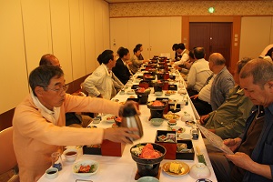 ホテルでの昼食は柔らかい近江牛だけかと思いきや、琵琶湖魚の「佃煮八珍」やビワマスのお造り、さらには小鮎のテンプラなどたいへん美味なお料理にジョッキや焼酎を重ねる人々で今回の旅も大満足。